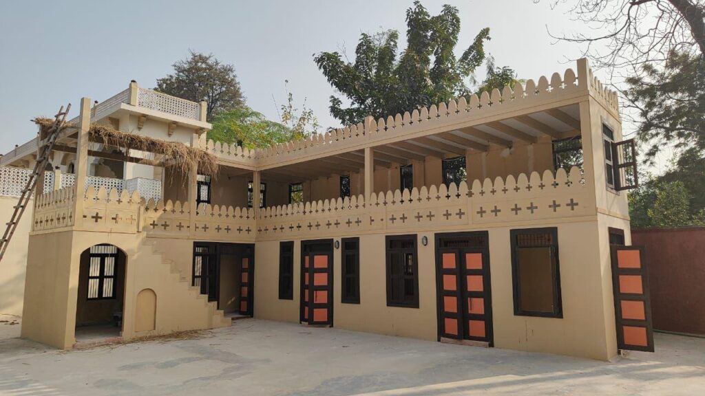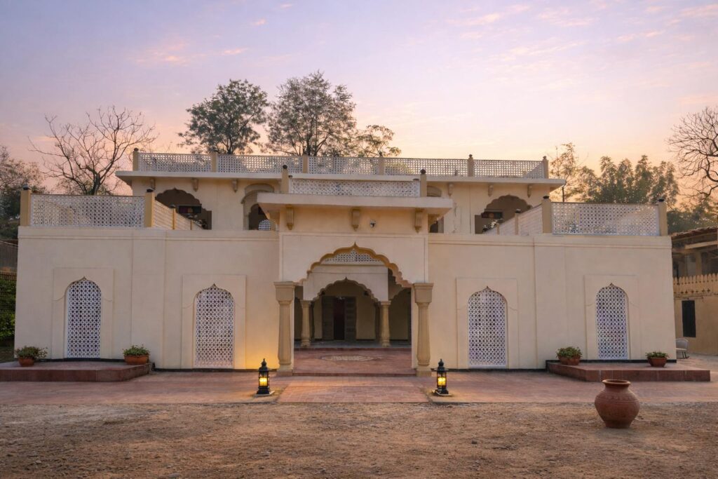 Experience a grand, two-story Middle Eastern facade featuring intricate latticework windows and a rooftop terrace that glows with golden lanterns for a magical night-time aesthetic.